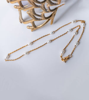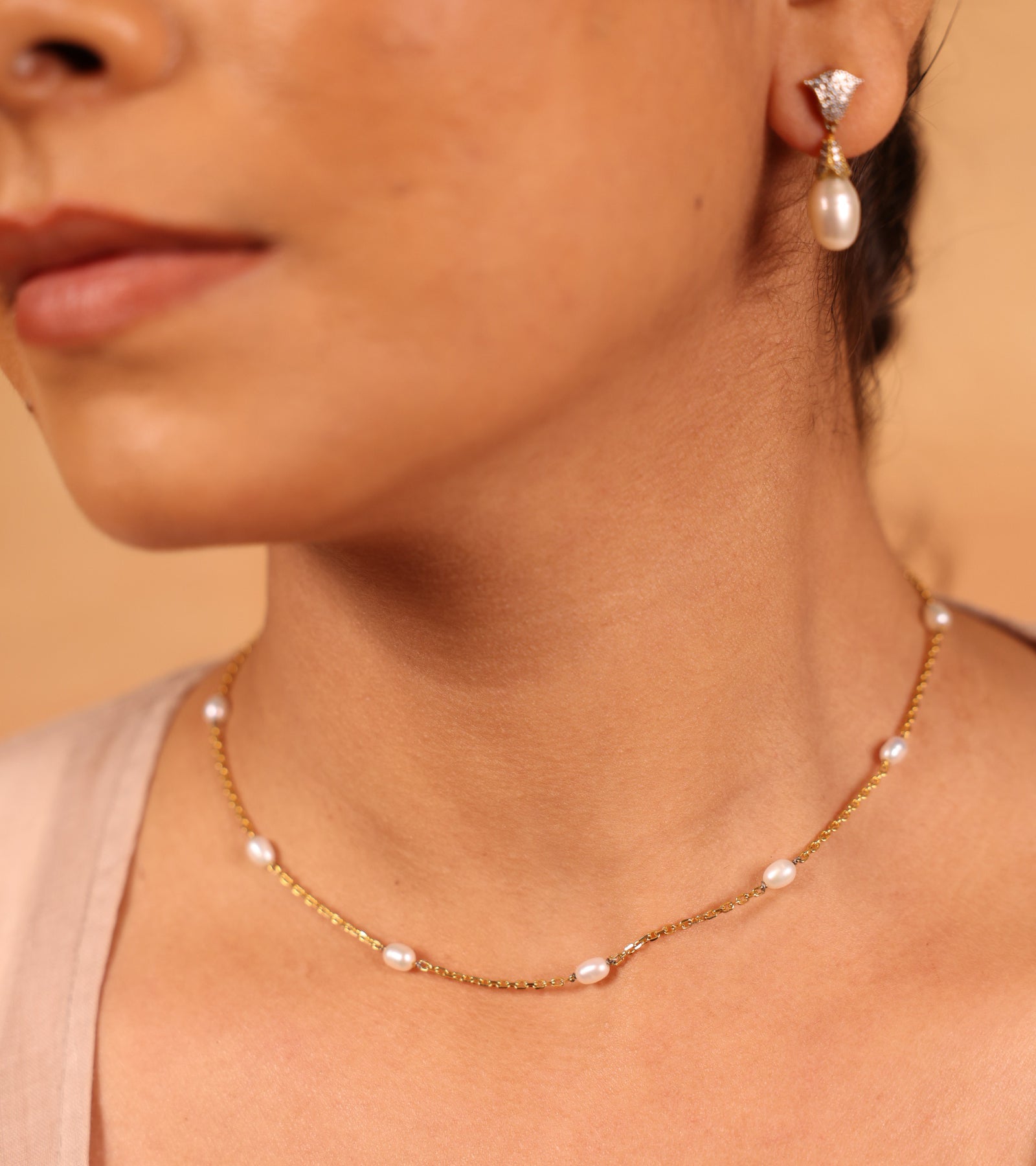 Aya Necklace — a delicate union of lustrous pearls and an 18K gold chain, set in perfect harmony to create an elegant, timeless piece. Its refined balance of gold and pearl makes it versatile enough to wear from day to night. Style it with a crisp white shirt for effortless daytime chic, or layer it with longer chains to add sophistication to your evening look