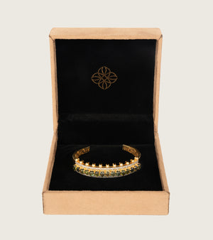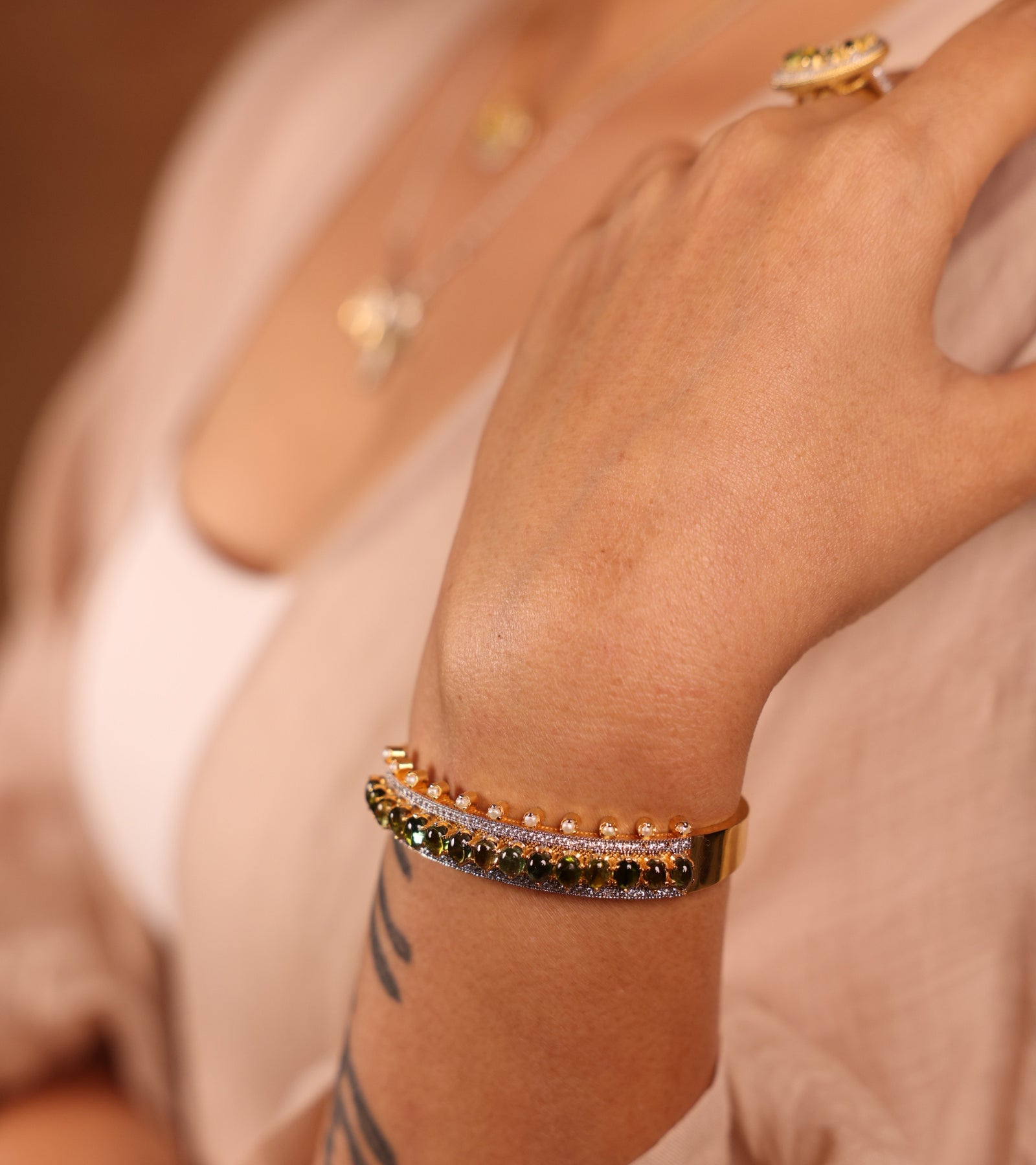 The Green Tourmaline Bracelet takes inspiration from Victorian crown motifs, echoing vintage charm while reimagining it for the modern woman. Set with lush green tourmalines that symbolize strength and accented with sparkling diamonds for brilliance, its crown-like silhouette feels both regal and timeless. Lightweight yet striking, this piece is perfect for elevating everyday luxe looks with a touch of heritage or adding sophistication to evening ensembles—an effortless modern heirloom designed to be treasured.