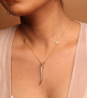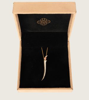 The Miraj dagger, a timeless symbol of power and protection, finds new meaning in UNCUT Modern as a piece that celebrates strength with subtle sophistication. Worn as an everyday luxe essential, it transitions effortlessly from work to evening—layer it with a crisp shirt and blazer for a sharp daytime look, or pair it with pearls and soft knits for an unexpected, feminine contrast. At its heart, it’s more than jewelry—it’s a reminder that UNCUT women carry their strength with grace, unapologetically bold in every moment.