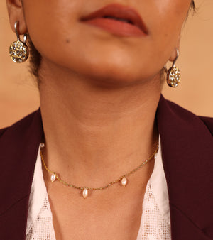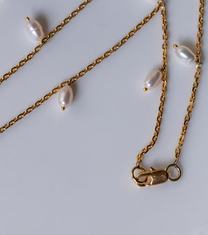 The Rex Necklace is strung delicately with luminous freshwater pearls on a fine gold chain, creating a beautiful play of pearl and gold that feels both modern and timeless. Wear it solo for understated elegance, layer it with longer gold chains for a chic contemporary look, or pair it with pearl studs to complete a classic ensemble.