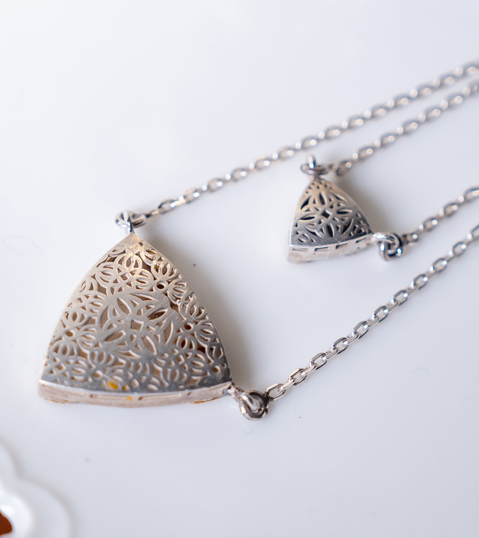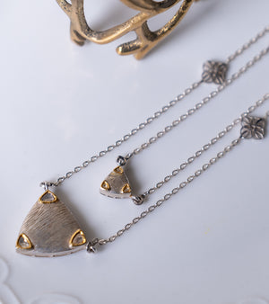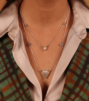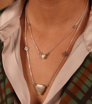 Sky Necklace Set — a beautiful duo of trillion chain necklaces that can be worn together, separately, or layered with other pieces from UNCUT’s UBAA collection. Effortless and versatile, they let you create your own style from day to night. Pair both chains for a bold layered look, wear one for minimal chic, or mix with longer pendants to add dimension