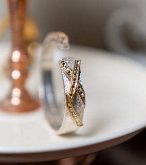 Unleash your inner royalty with UNCUT's Neo Open Bracelet. This handcrafted masterpiece combines gleaming silver, warm gold, and the brilliance of uncut diamonds to create a truly stunning piece. The open design offers a touch of modern flair, while the rich materials and expert craftsmanship ensure timeless elegance.