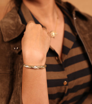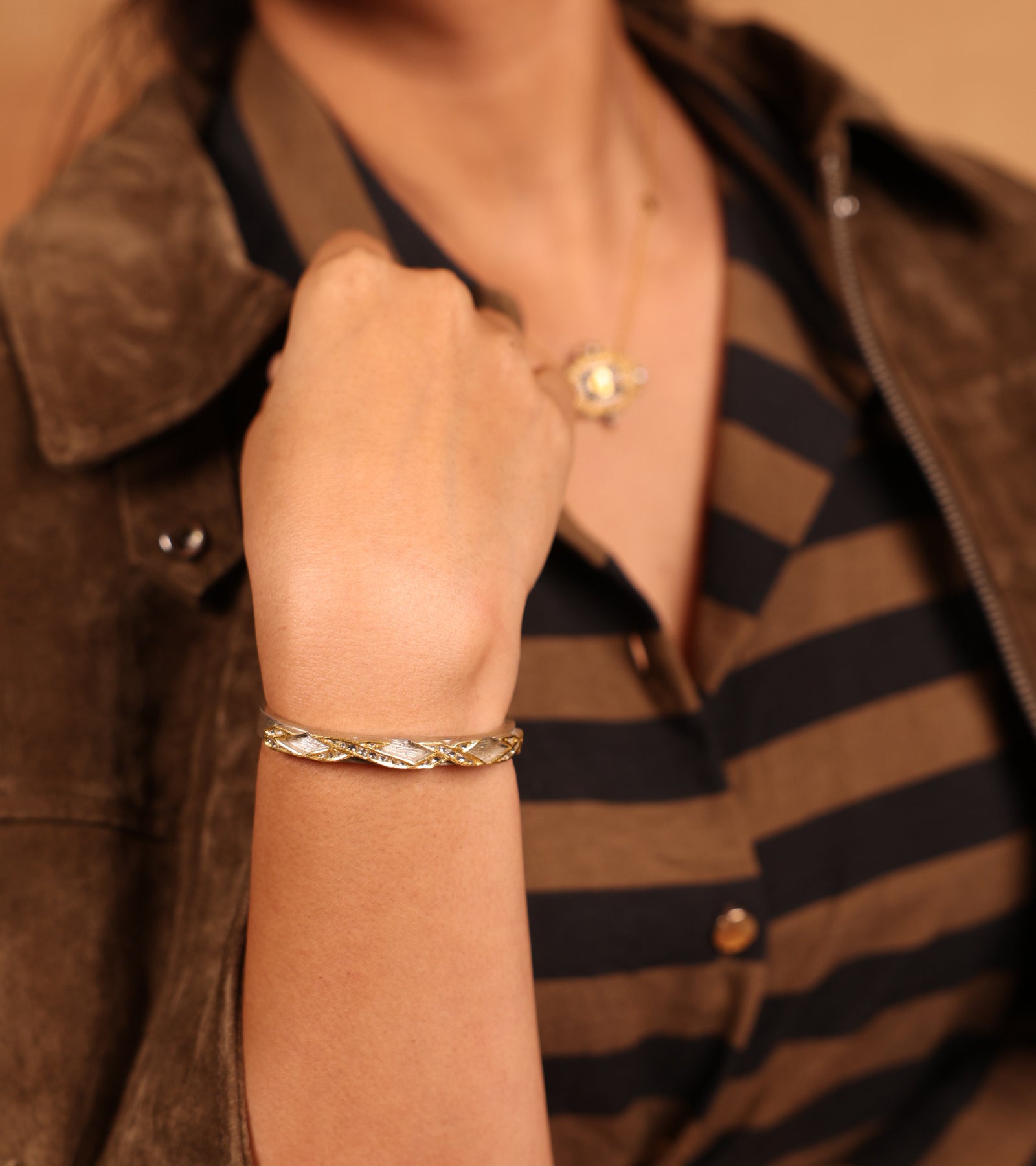 The Neo Bracelet from Uncut Jewelry is a masterpiece. This stunning bracelet features a beautiful blend of silver, gleaming gold, and sparkling syndicate polki diamonds, set in luxurious 24K gold. A versatile piece for any occasion, the Neo Bracelet can be worn solo for a touch of everyday elegance or stacked with other bracelets for a statement look. Crafted with 90% purity sterling silver, this bracelet is a testament to Uncut's commitment to quality and timeless design.