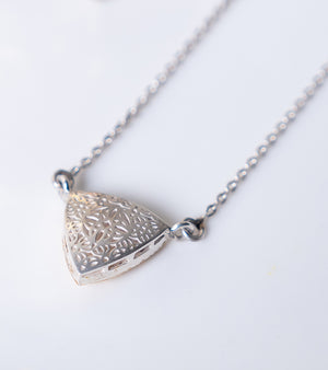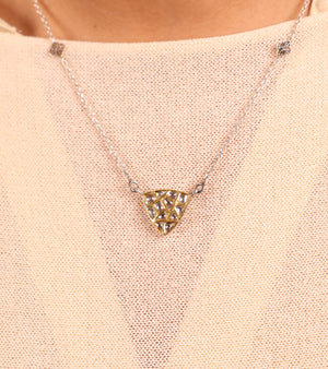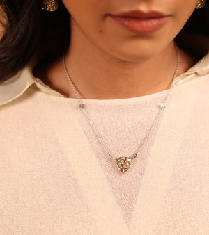 Tri Pendant — a beautiful trillion-shaped design set with natural polki diamonds in 22K kundan gold. Elegant yet versatile, it’s perfect for everyday luxe. Style it solo on a fine chain for a minimal statement, or layer with longer necklaces from the UBAA collection to create a chic, personalized look.