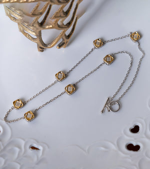 Uma Necklace | UBAA — delicate cushion-shaped charms with natural polkis set in 22K kundan, strung on an alternating silver chain. A refined everyday-luxe piece that works beautifully worn solo for subtle elegance or layered with longer chains for a modern, personalized look. Perfect from workday chic to evening ease.