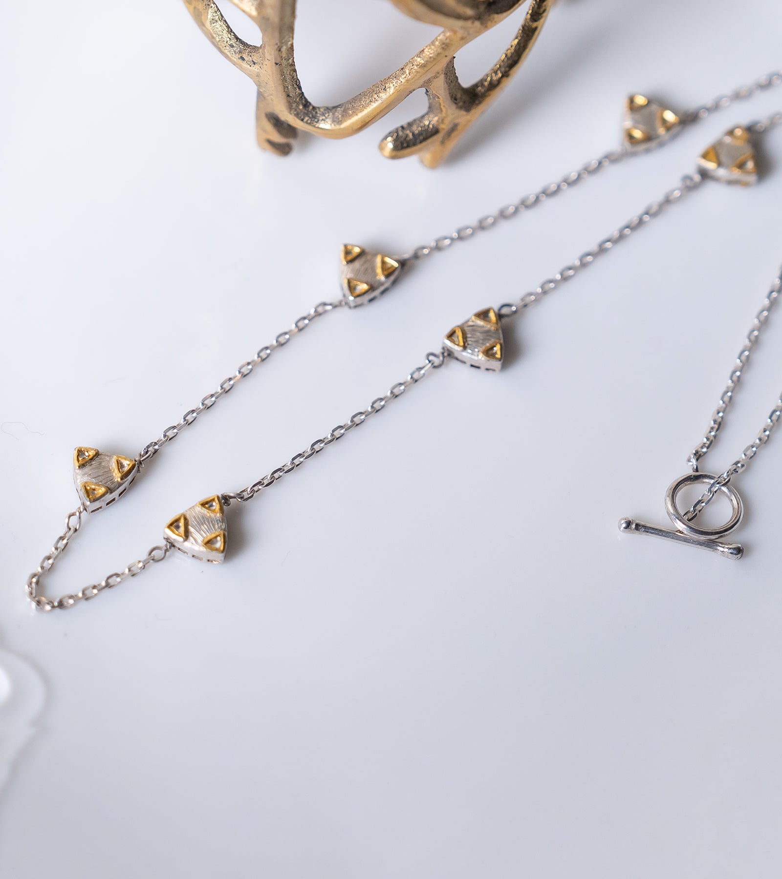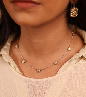 Zee Necklace — delicate trillion-shaped charms with natural polkis set in 22K kundan on an alternating silver chain. An effortless everyday-luxe piece, perfect worn solo for minimal elegance or layered with other necklaces for a chic, personalized look that transitions seamlessly from day to night