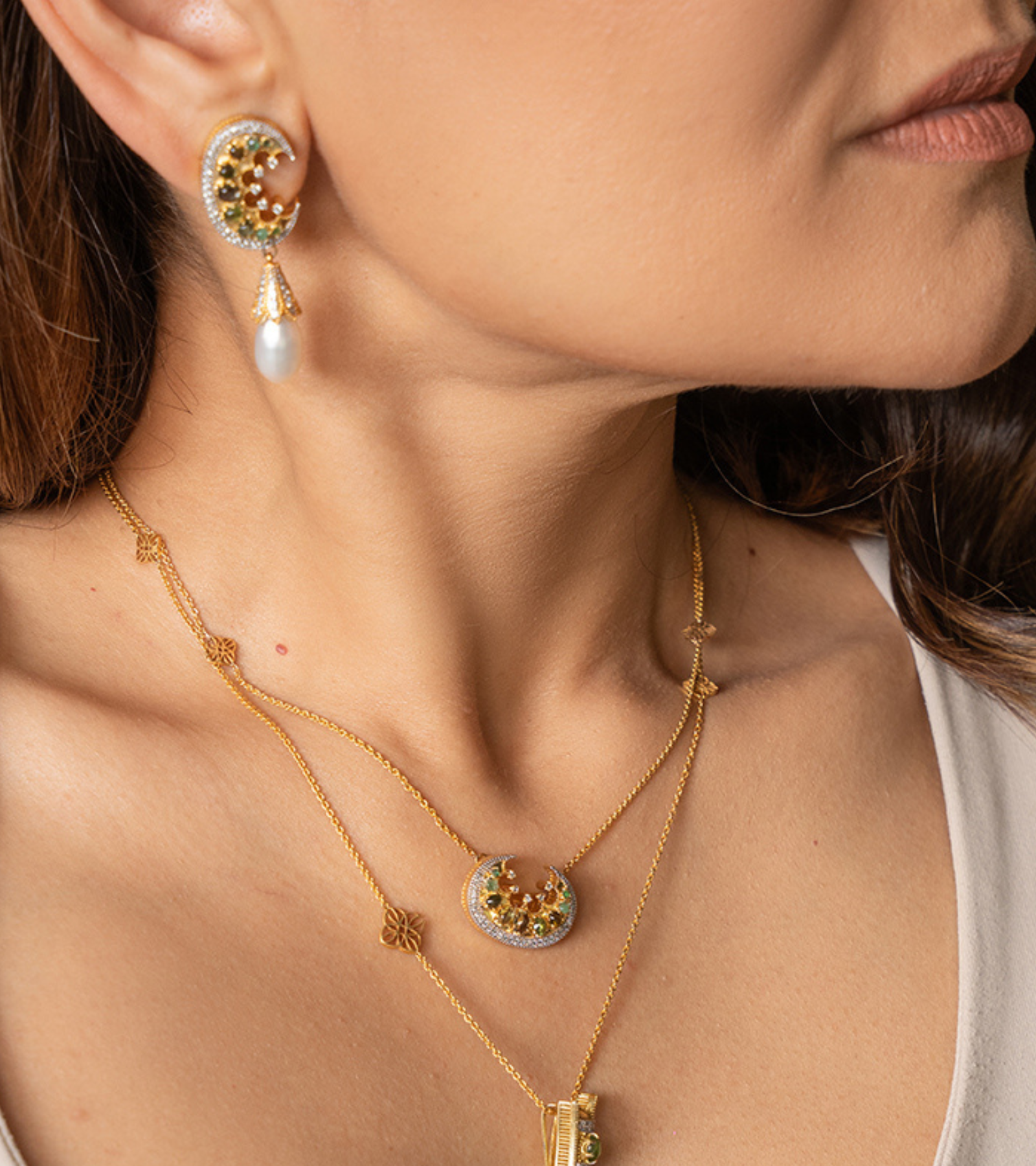 The Green Tourmaline Crescent Diamond Earrings echo vintage Victorian charm while reimagining it for the modern woman—tourmalines symbolizing strength, diamonds adding brilliance, and a crescent silhouette that feels both regal and timeless. Lightweight yet striking, they’re perfect for elevating everyday luxe looks or adding a touch of sophistication to evening ensembles.