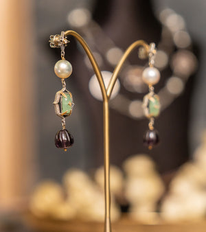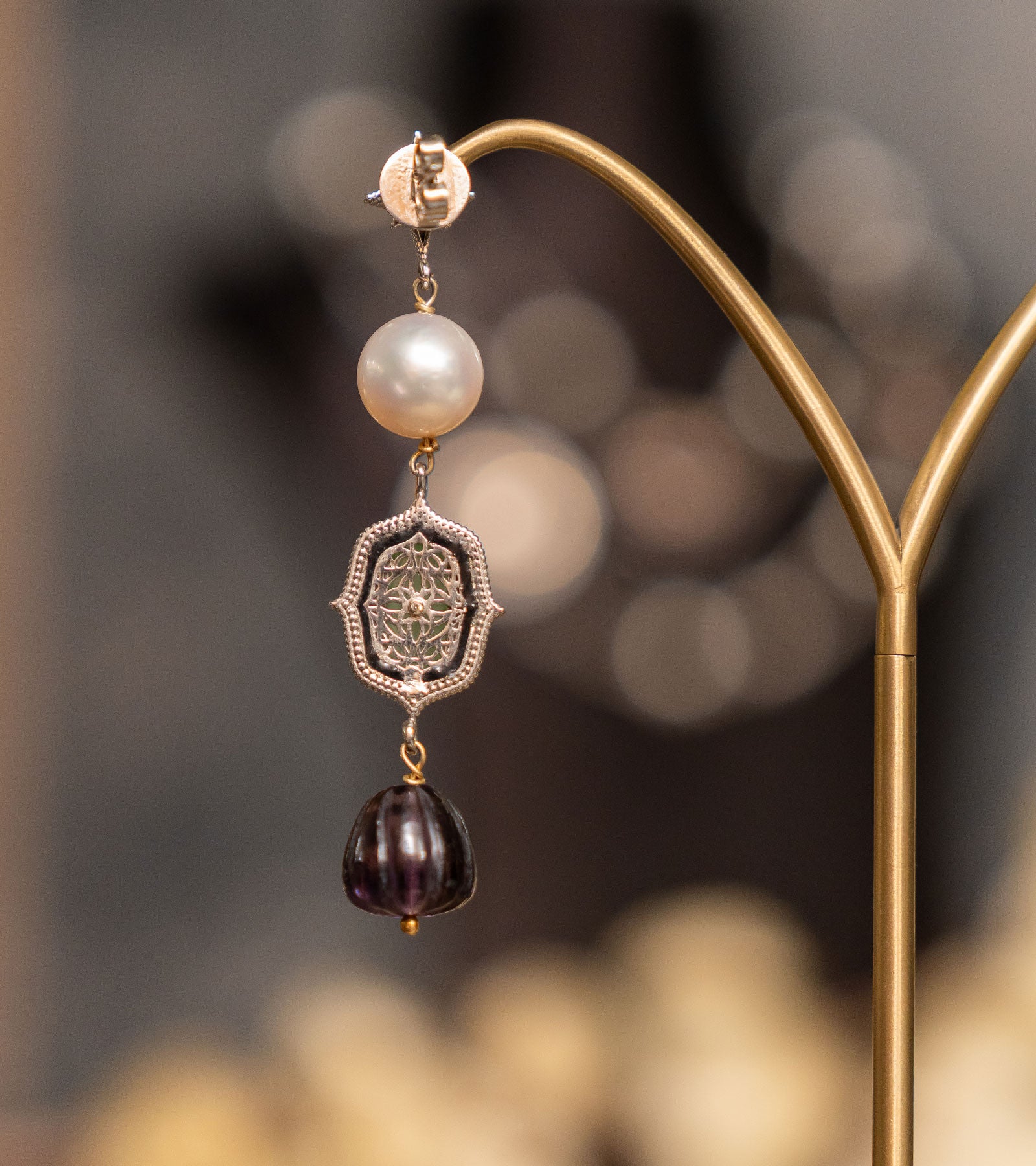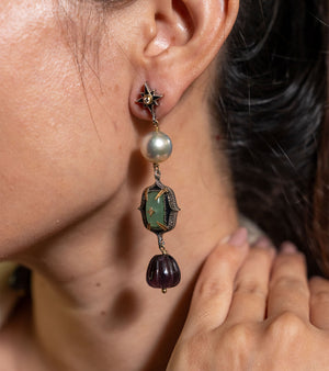 The Zen Earrings reinterpret vintage Indian jewellery through a modern lens. Rich Aqua Onyx and Amethyst Crystal are paired with luminous South Sea Pearls, set in silver with 18K gold accents and finished in hand-painted black enamel. Rooted in heritage yet designed for today, they carry an old-world soul with a contemporary silhouette.