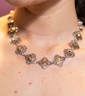 The Ora Necklace is a contemporary talisman—where the symbolism of the Navagraha meets the elegance of everyday luxe. Crafted in silver with 18K gold, Polki diamonds, and Nav Grah gemstones, the necklace reimagines the classic uncut flower ribbon motif in a fresh, modern silhouette. Meaningful, versatile, and quietly powerful, it’s designed as a daily companion that carries intention and beauty in equal measure. Wear the Ora Necklace with a crisp shirt, slip dress, or a simple kurta to let its talismanic colors shine. Perfect for layering with delicate gold chains or wearing solo for a clean, modern look.