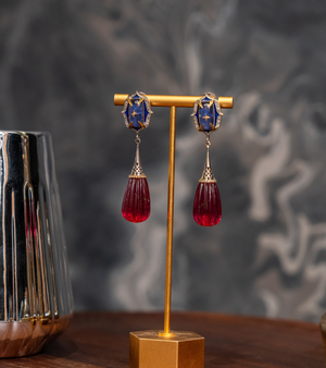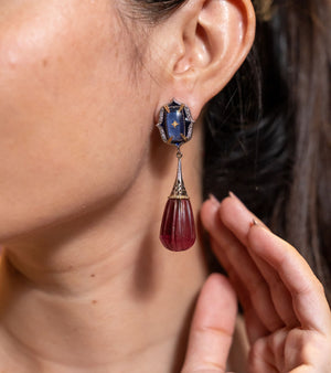 Sur Earrings — Sitara Collection. The Sur Earrings blend celestial elegance with modern Indian design. Crafted in silver with 18K gold, they feature natural FG VS diamonds, Manifé Tourmaline, and blue hand-painted enamel—a refined fusion of color, light, and craftsmanship. Perfect with sleek hair and both Indo-western and festive looks, especially in midnight tones or soft pastels.