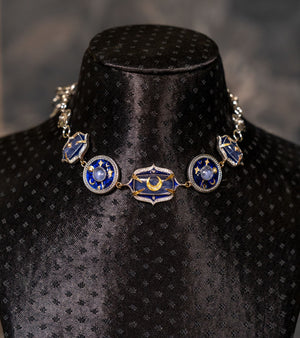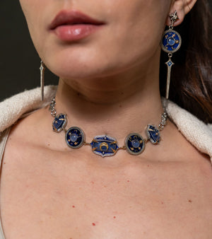 The Taskan Choker is where clarity meets complexity — a harmonious blend of heritage and modernity. Crafted in silver with 18K and 22K gold, it features natural FG VS diamonds, Polki (Vilandi), precious gemstones, and hand-painted blue enamel. A statement in timeless craftsmanship,