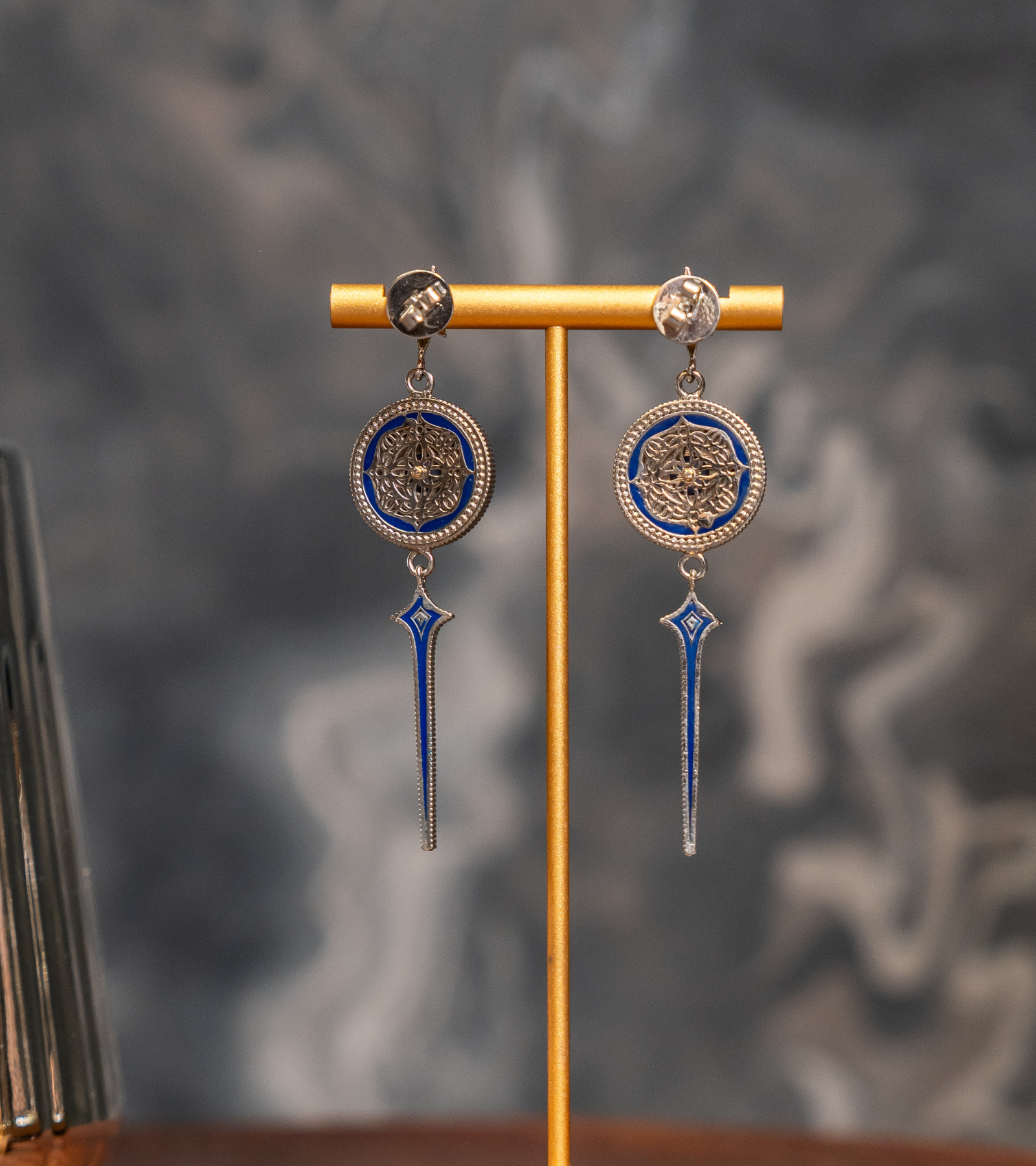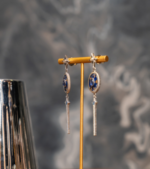 Inspired by the quiet glow of a starry night, the Alex Earrings pair 18K gold, natural FG VS diamonds, Kyanite gemstones, and blue hand-painted enamel to create a sleek, celestial silhouette. Crafted in silver and accompanied by an Authenticity Certificate, they bring effortless elegance to both day and evening looks. Let the midnight blue tones shine with crisp whites, soft pastels, or classic black. Wear with a low bun or sleek hair for a polished, celestial finish.