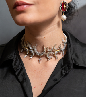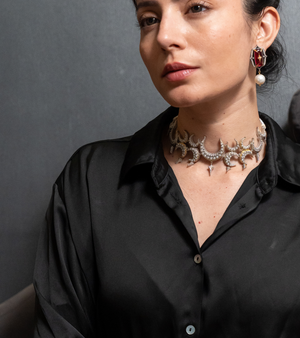 The Ikra Choker is an iconic UNCUT by Aditi Amin design that draws deeply from Indian heritage while remaining strikingly fashion-forward. Crafted in silver with natural FG VS diamonds, delicate China pearls, and hand-painted black enamel, the piece reinterprets traditional Indian jewellery through a bold, contemporary lens. Rich in character and presence, it is a powerful statement choker designed to turn heads.