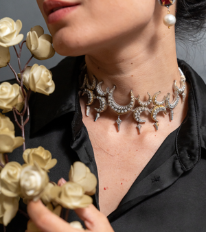 Wear it with a deep neckline, structured blouse, or classic sari to highlight its strong silhouette. It pairs beautifully with monochrome outfits or festive Indian ensembles, allowing the choker to become the defining element of the look.