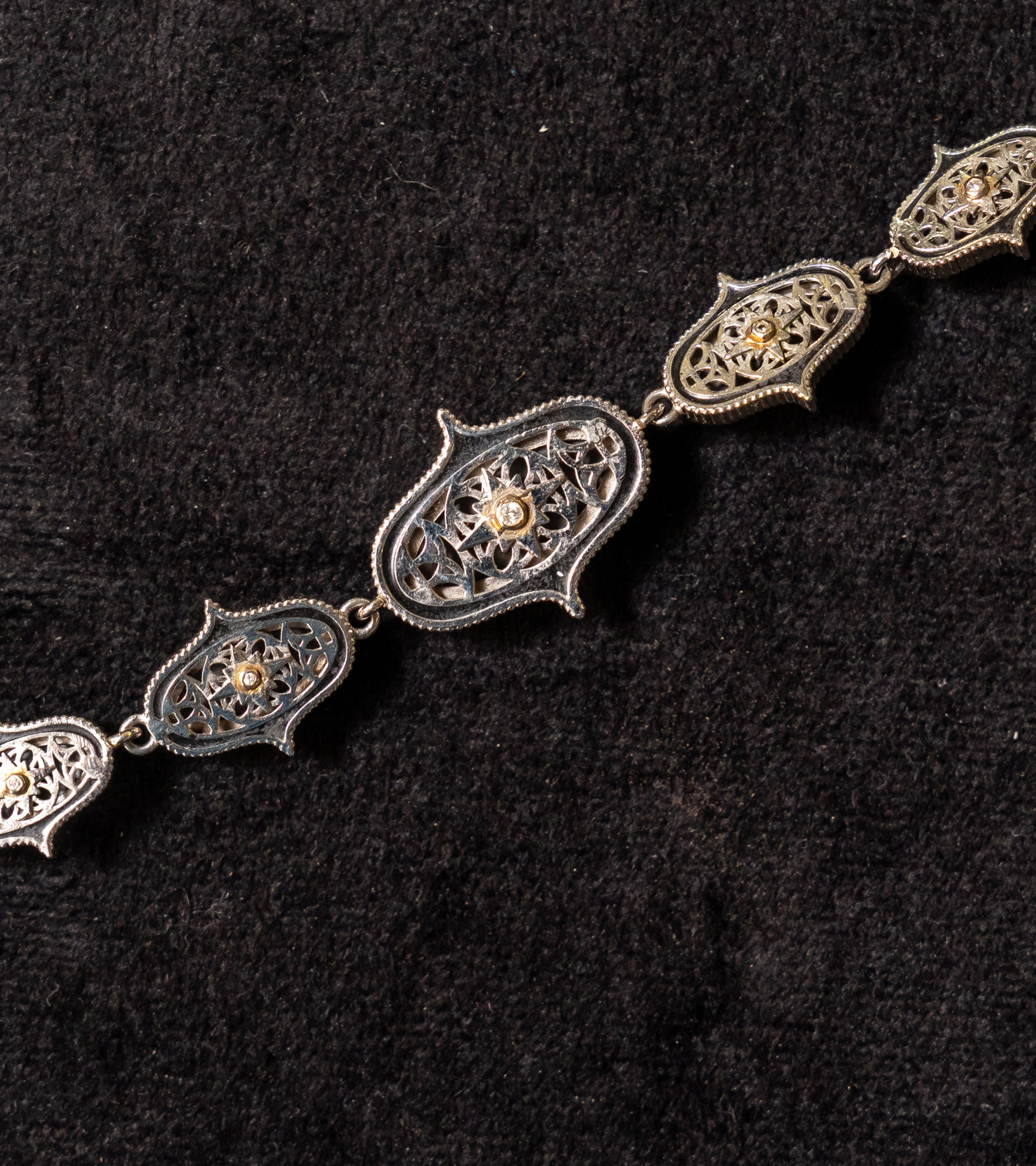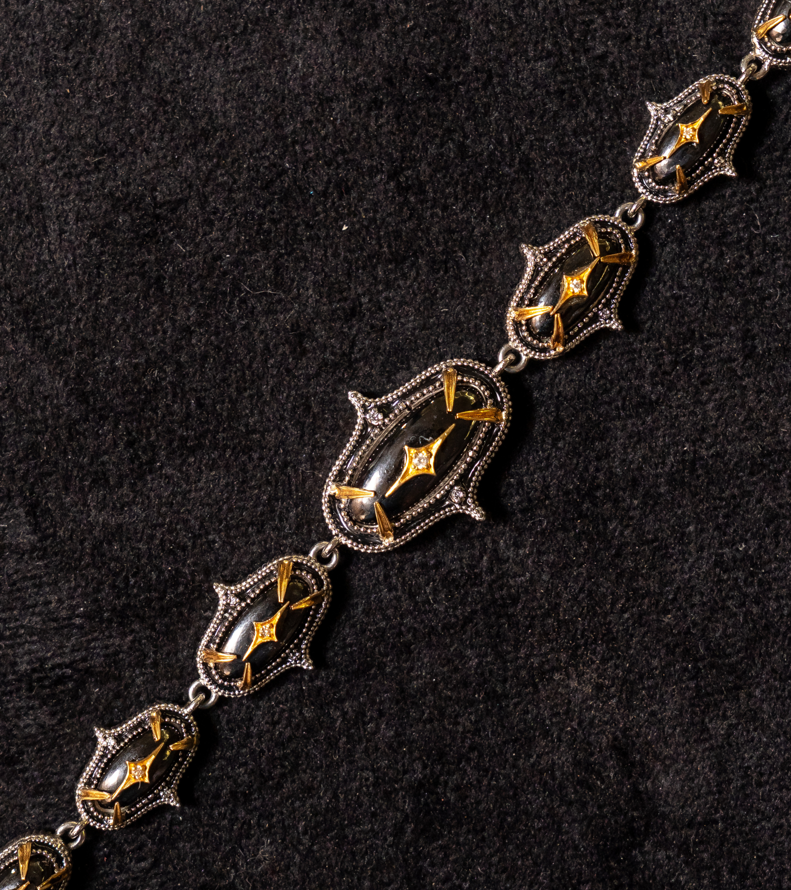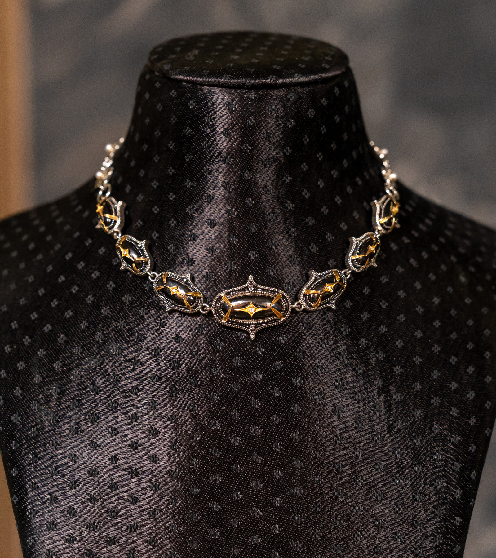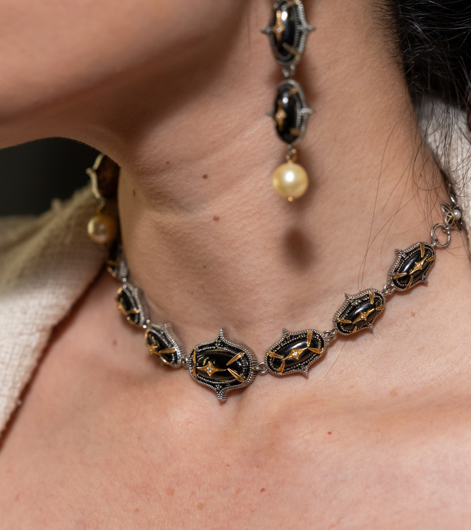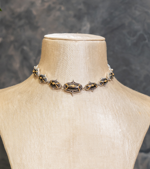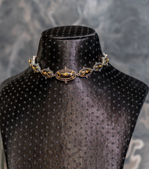 A modern Indian classic, the Jaipur Necklace blends clean, contemporary lines with traditional craftsmanship. Crafted in silver with accents of 18K gold, hand-painted black enamel, Black Onyx stones, and subtle FG VS diamonds, it is designed to move effortlessly from day to night. Style it with a crisp kurta or sari for daytime elegance, and pair it with silk, an anarkali, or a blazer for evenings and occasions—timeless, versatile, and distinctly UBAA.