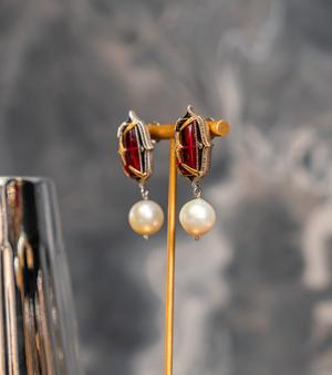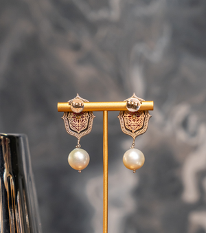 Crafted in silver with 18K gold accents, the Rewa Earrings feature rose crystal stones, FG VS diamonds, black hand-painted enamel, and natural South Sea pearl drops. Designed as a statement yet timeless piece, they transition effortlessly from refined daywear to evening occasions. Style them with structured silhouettes, classic saris, or modern ensembles to let the detailing take centre stage.