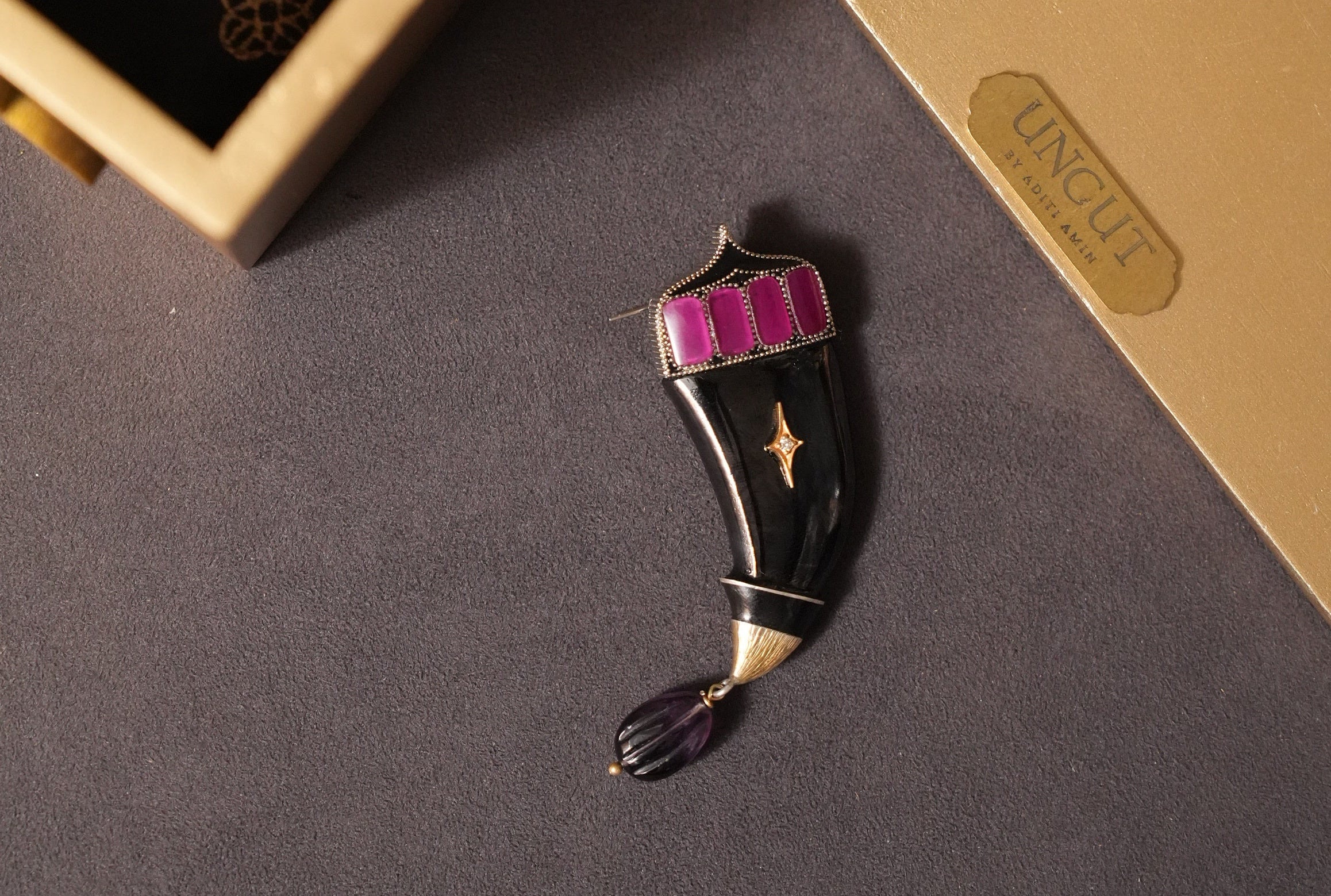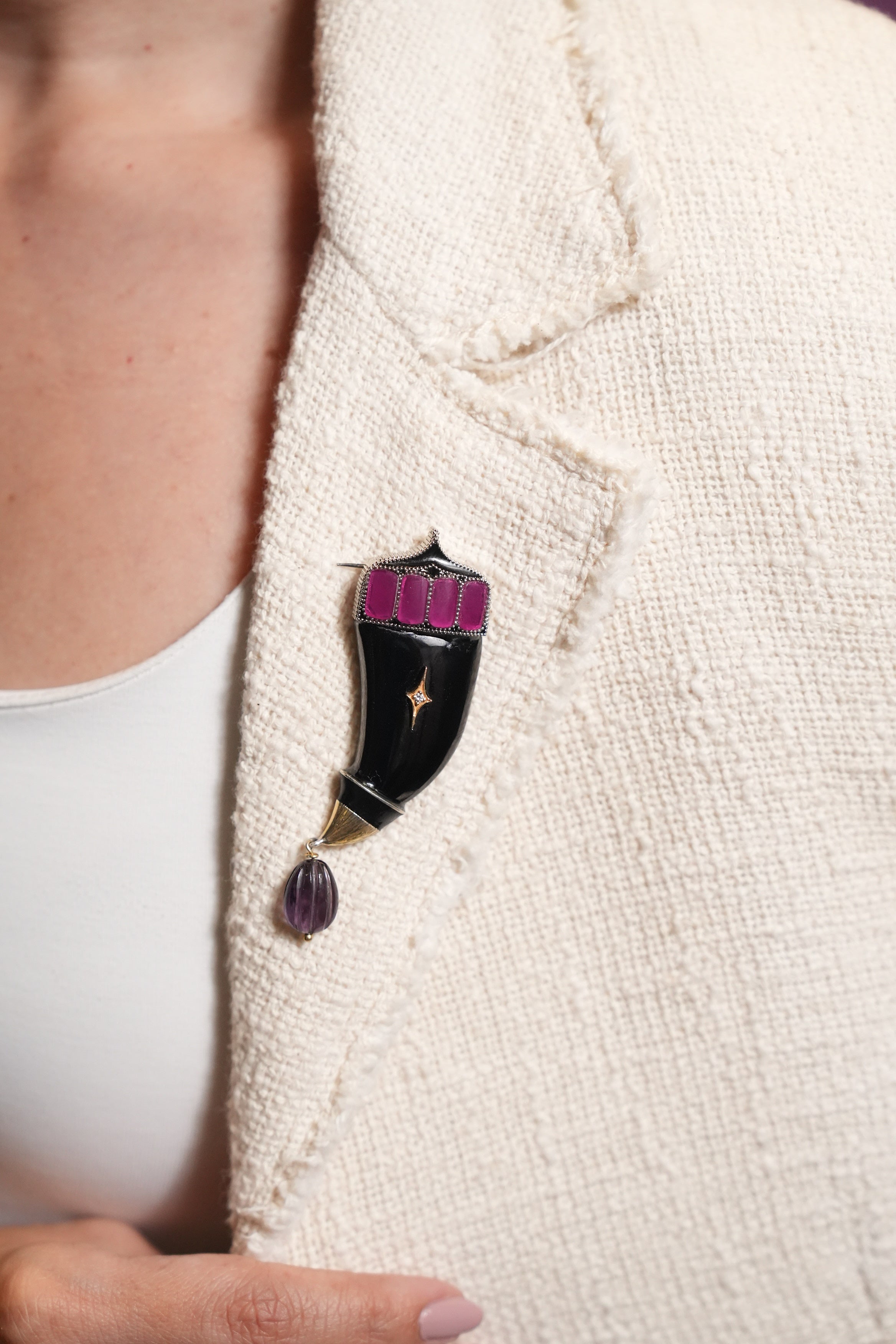 A symbol of power, protection, and quiet authority, the Tiger Brooch is crafted in 18K gold and silver, set with FG VS diamonds, black onyx, amethyst and rose crystal, and finished in hand-painted black enamel. Bold yet refined, it embodies modern Indian strength with an unapologetic edge.Designed for versatility, it can be worn as a brooch or as a pendant — styled on denim, fusion silhouettes, or classic Indian wear. Wear it as armour. Wear it as identity.